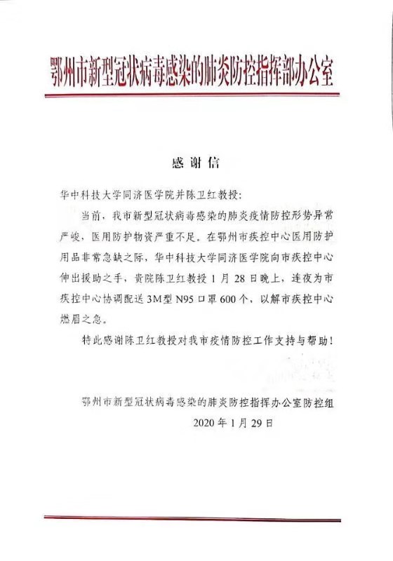 1月28日晚,我院劳动卫生与环境卫生学系主任陈卫红教授连夜为鄂州市疾控中心协调配送3M型N95口罩600个,以解燃眉之急。