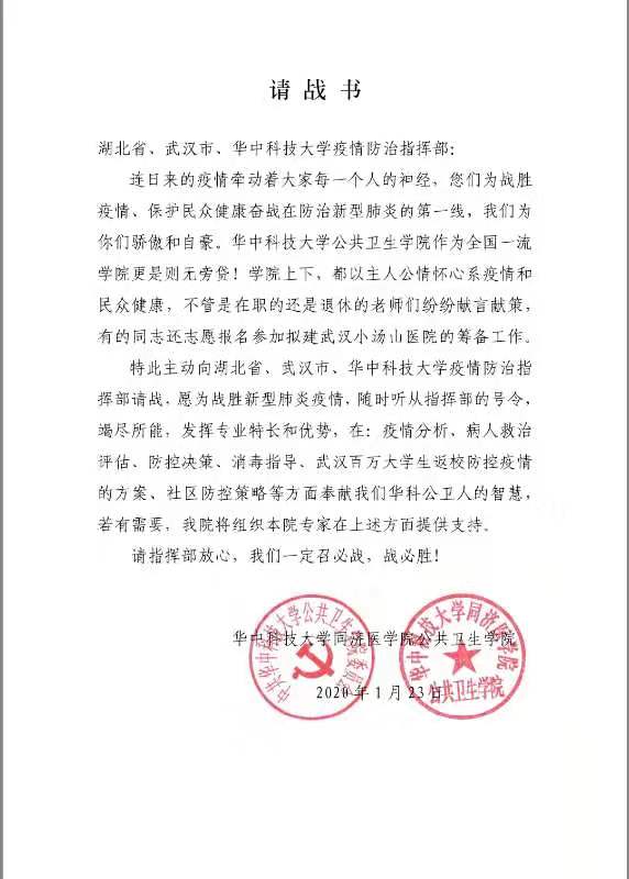 我院作为“双一流”建设学科在疫情初期主动向湖北省、武汉市、学校疫情防治指挥部递交《请战书》,学院上下纷纷建言献策,在疫情分析、病人救治评估、防控决策、消毒指导、社区防控策略等方面提供支持,向指挥部表露出了“召必战、战必胜”的信念。