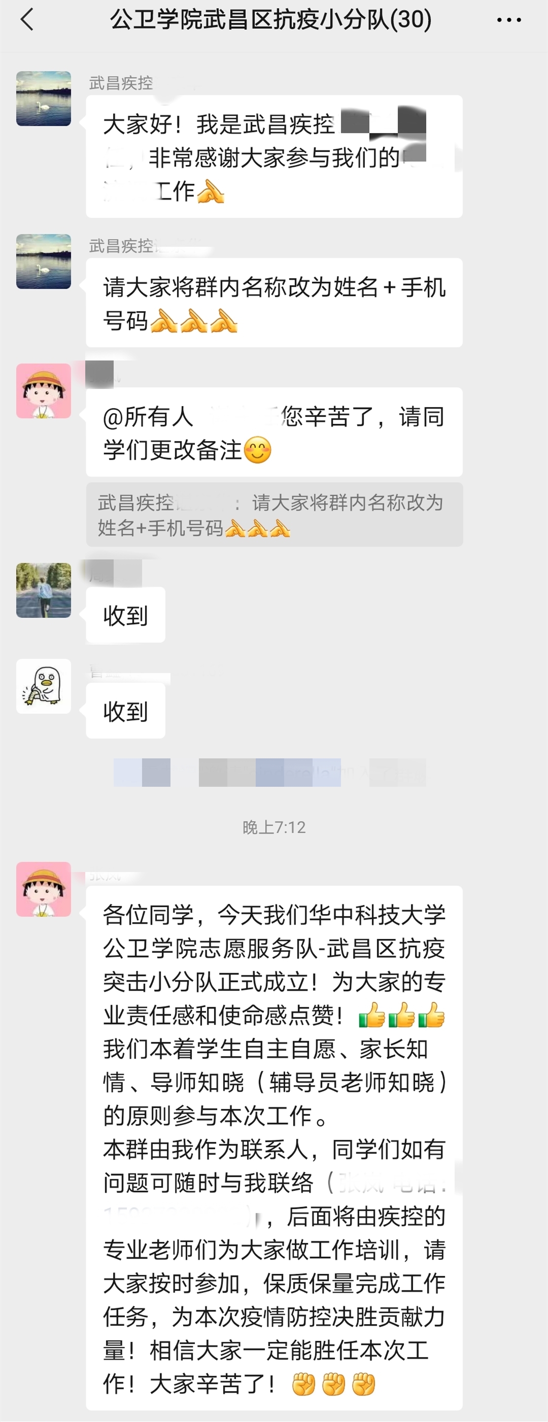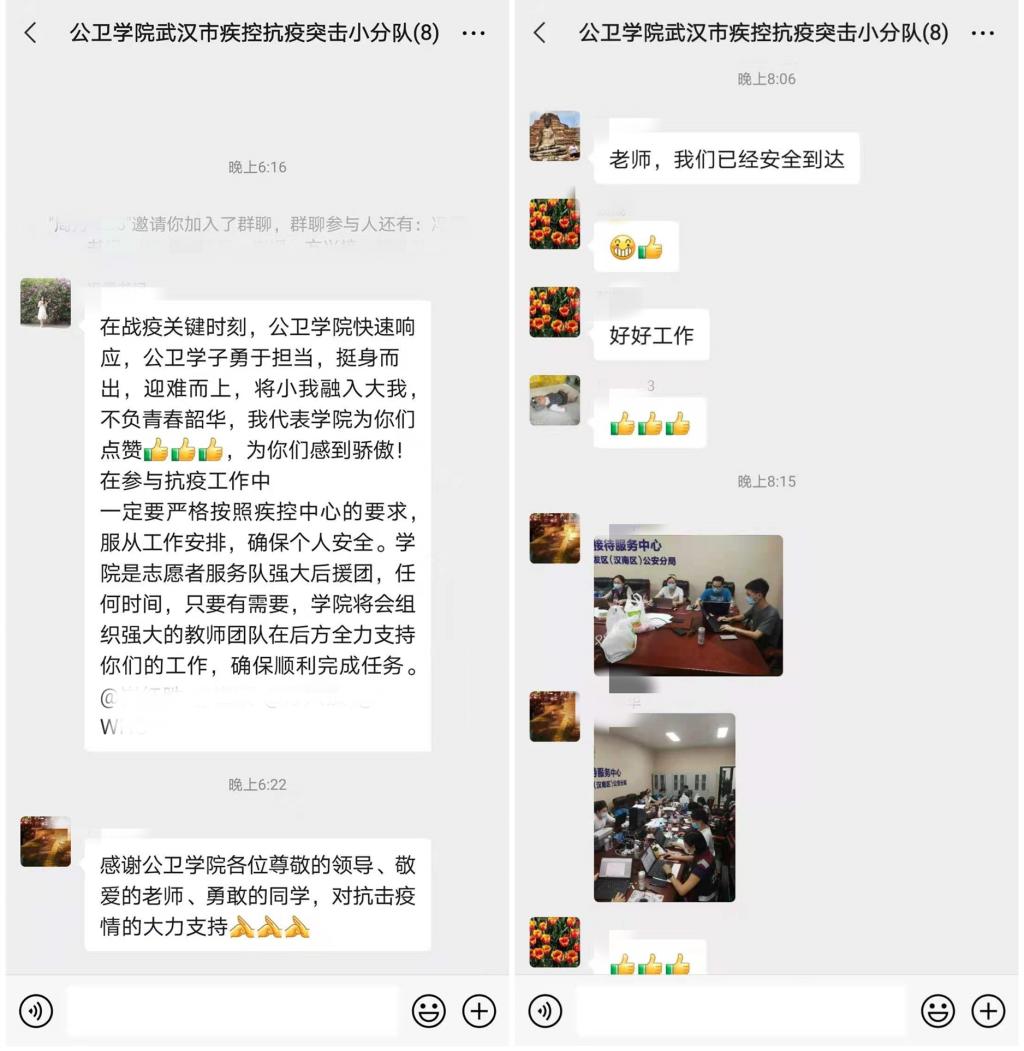 由于时间紧迫和疫情防控原因,学院无法召开线下动员和出征会议,学院党委副书记冯霞在各支抗疫服务队微信工作群中为志愿者们作了出征动员发言,她对这次请战的全体学生给予了高度肯定与表扬,她指出新冠疫情来袭,我们公卫人理应义不容辞,这次抗疫志愿服务工作不仅是一次专业实战演练,更是一次难得的培养公卫学生专业使命感、责任感及提高学生专业技能、理论联系实践能力的宝贵机会。她叮嘱大家一定要发挥华中大公卫人的优良传统和工作作风,在参与抗疫工作中严格落实疾控中心要求,服从工作安排,确保个人安全,发挥专业优势,高质量完成任务。