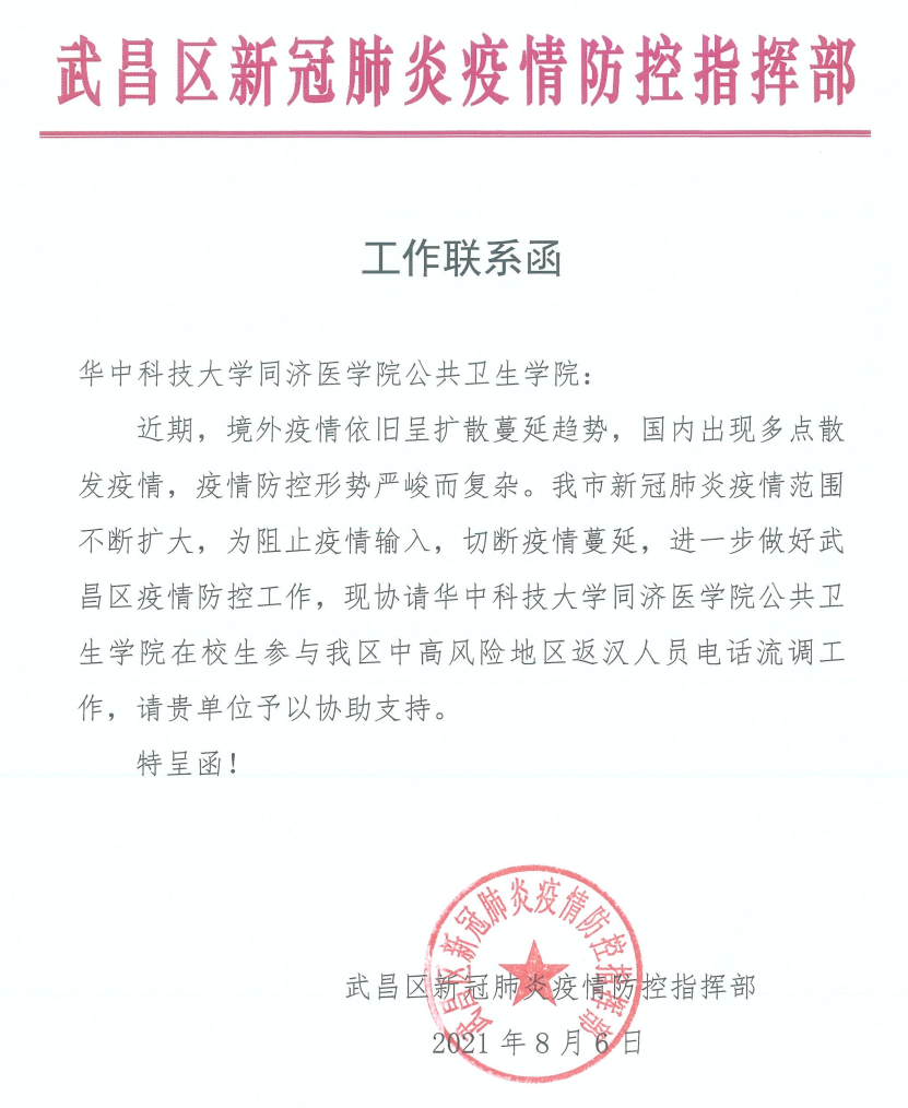 近期,境外疫情依旧呈扩散蔓延趋势,国内出现多点散发疫情,武汉市疫情防控形势严峻。为阻止疫情输入,切断疫情蔓延,进一步做好疫情防控工作,湖北省卫生健康委、武汉市疾病预防控制中心、武昌区新冠肺炎疫情指挥部分别向我院来函,协请我院选派学生志愿者参与省、市、区新冠肺炎疫情防控工作。