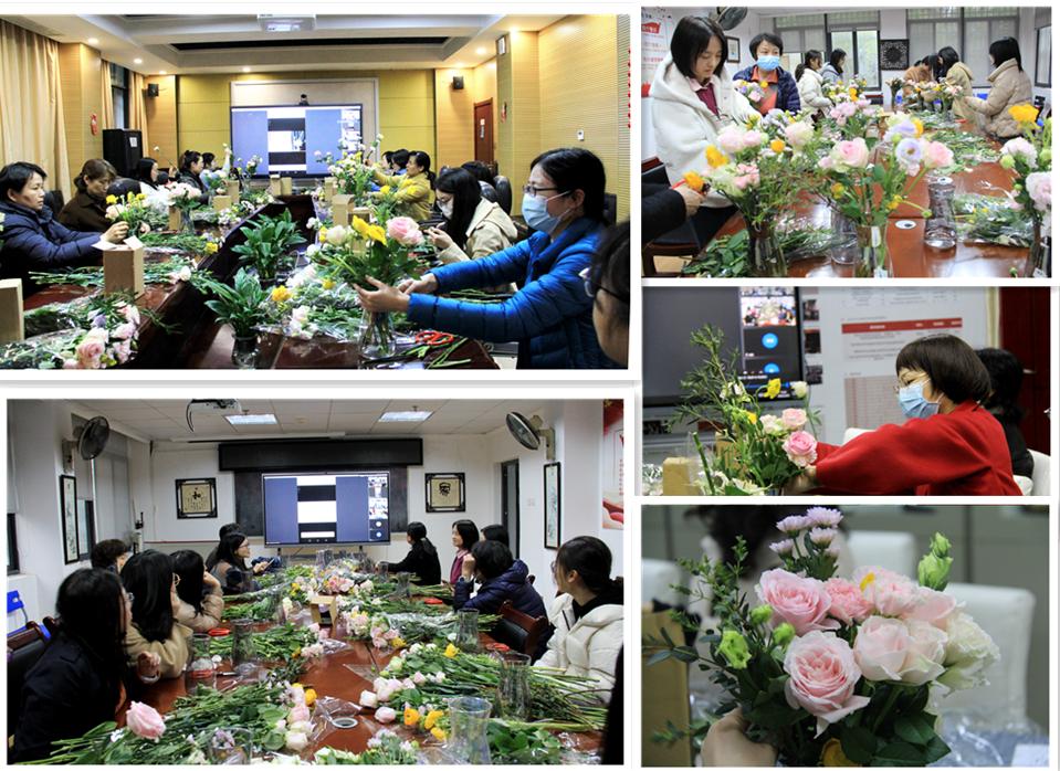 “插花的时候,高的在中间,矮的在旁边,不可太繁,亦不可太瘦,要讲究高低梳密,错落有致。”来自武汉神东蓝美文化传播有限公司的花艺老师在线上为大家讲授花材识别、花语文化、色彩搭配、东西方插花区别以及插花实操技巧。女教工们一边聚精会神地学习花艺知识,一边跟着老师的指导完成自己的花艺作品,大家相互交流探讨,积极与老师线上互动,现场气氛热烈融洽。
