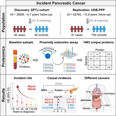 胰腺癌是一种高度恶性的消化系统肿瘤,在所有癌症死因中排名第三。胰腺癌的人群发病率虽然不高,但其发病隐匿,预后情况极差,被称为“癌症之王”。目前,由于缺乏临床可用的生物标志物,胰腺癌患者难以被早期发现和治疗。相比于晚期胰腺癌患者仅3%的5年相对生存率,早期胰腺癌患者的5年相对生存率可大幅提升至40%。因此,识别用于胰腺癌早期诊断的生物标志物具有重要意义。血液蛋白作为反映人体生理和病理状态的关键分子,在癌症早期诊断等方面具有重要价值。前期研究已经发现一些血液蛋白标志物可以反映不同肿瘤的发生或进展过程,但由于胰腺癌在自然人群中发病率低,需要超大型前瞻性队列才能够收集到一定数量的新发病例样本,实施难度巨大。因此,目前对胰腺癌的研究主要集中在进展期病例,极少标志物被证实可以在确诊前数年提示胰腺癌发生风险,为胰腺癌的早期诊断带来巨大挑战。
