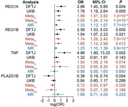 图2:四种候选蛋白标志物与新发胰腺癌风险的效应估计值。OR为标准化蛋白表达每增加1-SD的风险变化。log(OR)为OR的自然对数及其95%置信区间。UKB:仅限于随访6年内匹配亚组的新发病例。meta分析(Metafix:固定效应meta分析;Metaran:随机效应meta分析)和孟德尔随机化分析(MR)的结果分别用红色和蓝色表示。