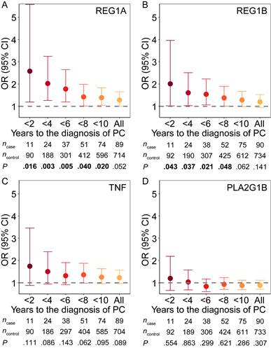 图3:UKB研究中四种候选蛋白标志物和胰腺癌风险的相关性。(A)REG1A;(B)REG1B;(C)TNF;(D)PLA2G1B。ncase:新发胰腺癌样本量;ncontrol:匹配对照样本量。