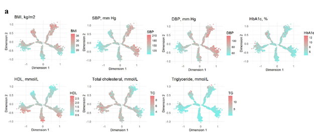 该研究基于中国全国代表性人群(CCDRFS),纳入10,091名新发2型糖尿病患者。研究团队创新性地应用判别降维树算法(DDRTree)将常规临床指标(如HbA1cBMI、血压、血脂)转化为直观的树状图谱,在二维结构中展示患者表型的连续分布。图谱上的每个点代表具有特定表型特征的个体,混合特征的患者位于主树干中心,极端表型逐渐延伸至树梢,从而更清晰地呈现糖尿病的异质性,避免了传统硬性分类的局限。
