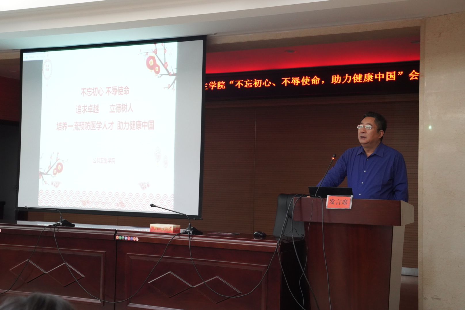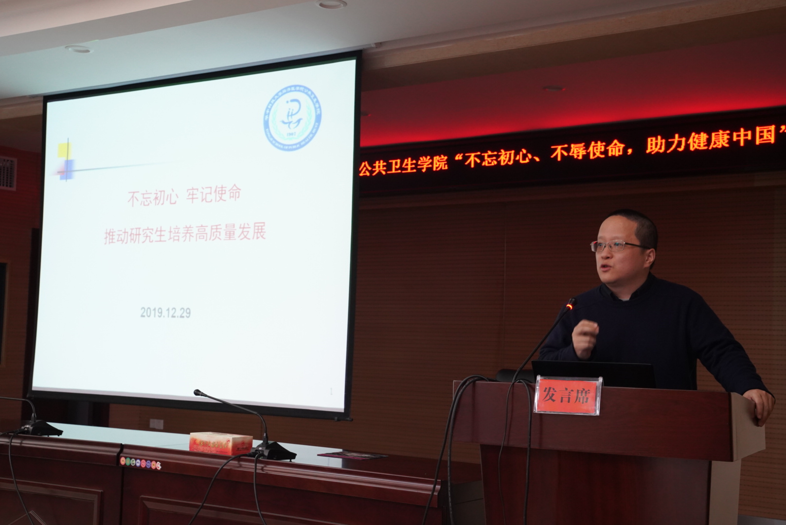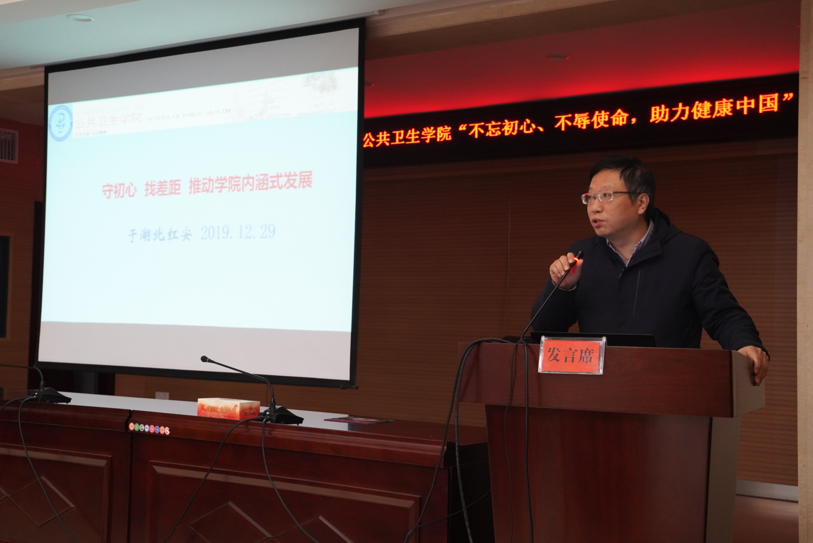 上午的会议由学院领导班子依次做报告,首先由院长邬堂春教授就大会主题作报告,题为《不忘初心、不辱使命,追求卓越、立德树人,培养一流预防医学人才,助力健康中国》。通过回顾了我院从2006年至今的发展情况,以观看《我和我的祖国》后的几点感想为引,结合当前我院各项重大任务,他鼓励各位教师们要继续发扬我院精神,谨记“办法总比问题多”,坚持培育出一流的预防医学人才,为健康中国而努力贡献我们的力量,再创学院发展新辉煌!