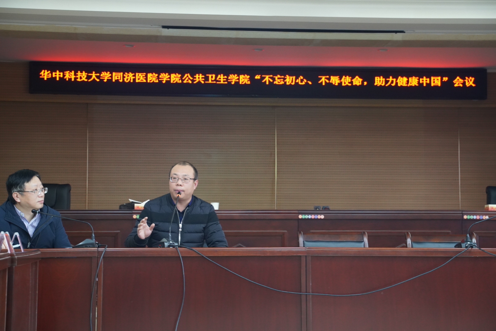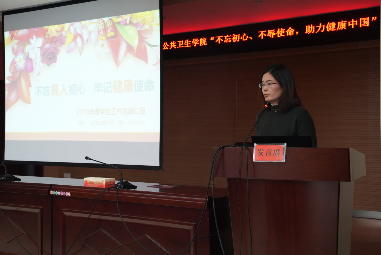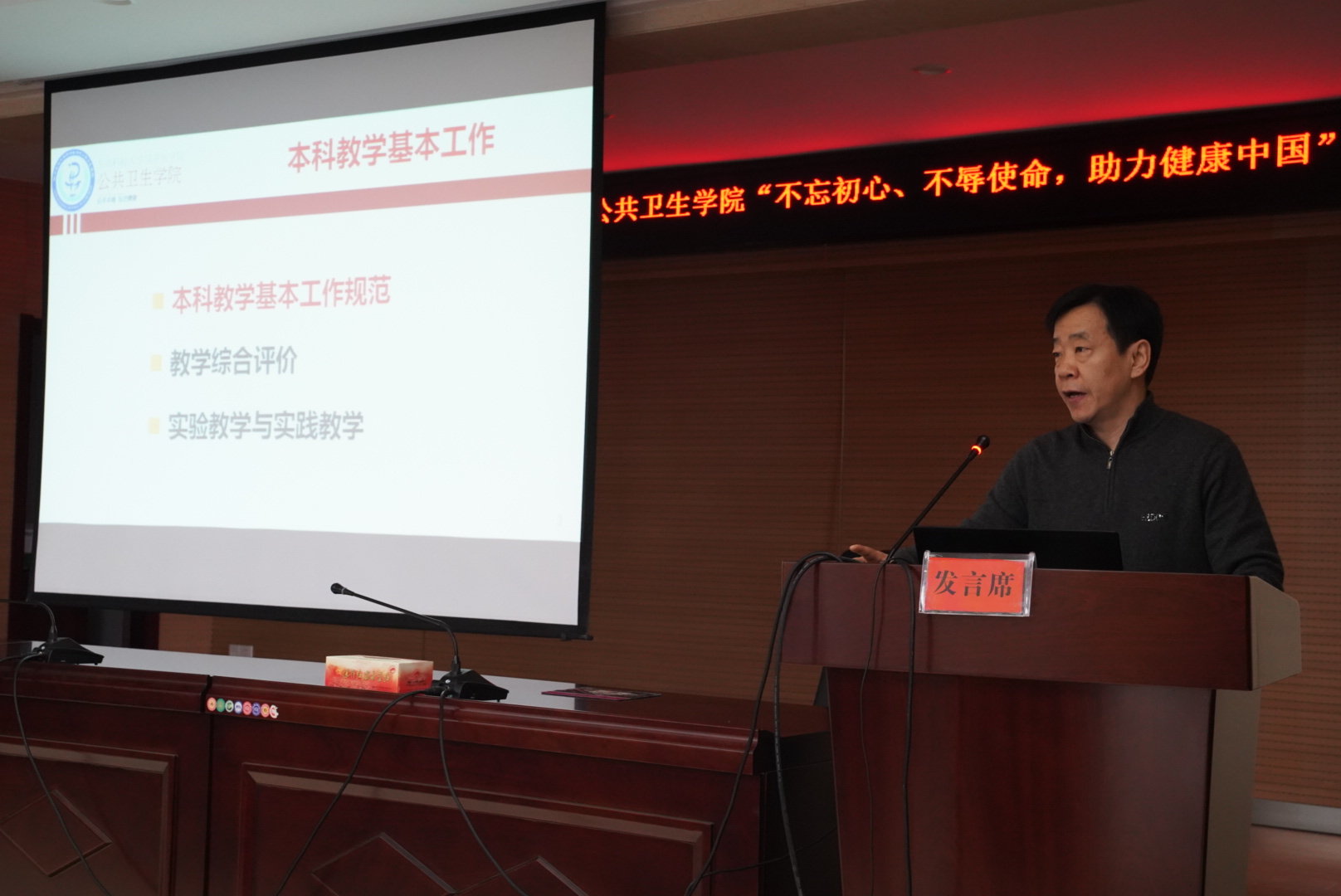 上午的会议由学院领导班子依次做报告,首先由院长邬堂春教授就大会主题作报告,题为《不忘初心、不辱使命,追求卓越、立德树人,培养一流预防医学人才,助力健康中国》。通过回顾了我院从2006年至今的发展情况,以观看《我和我的祖国》后的几点感想为引,结合当前我院各项重大任务,他鼓励各位教师们要继续发扬我院精神,谨记“办法总比问题多”,坚持培育出一流的预防医学人才,为健康中国而努力贡献我们的力量,再创学院发展新辉煌!