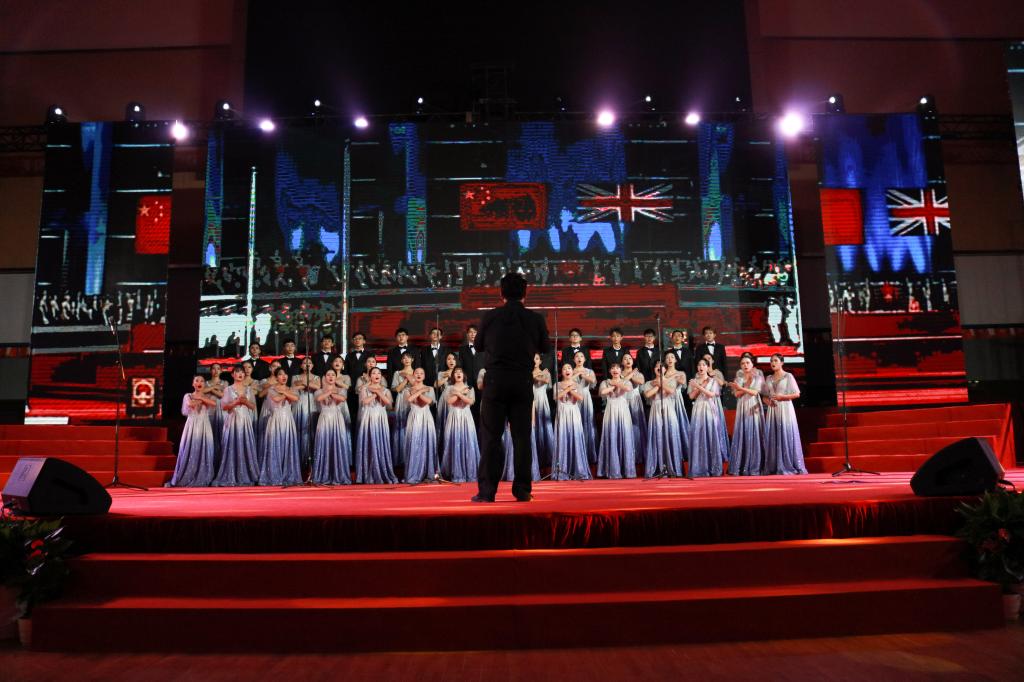 当我院表演的乐声响起时,合唱队员们开始随乐声轻轻摇摆,如同一个个跃动的音符;歌声轻轻荡漾着,喧闹的体育馆安静了;歌声拧成一线,在空气中起伏;“我爱你中国”,宽广宏亮但不歇斯底里,深情自豪不论今夕何夕。在歌曲尾处,齐声歌唱:“我爱你,中国!”瞬间全场沸腾。合唱背景视频也别具一格,这既体现了公卫人的团结与爱国,也凝聚了william威廉英国全体师生的灵感与汗水。