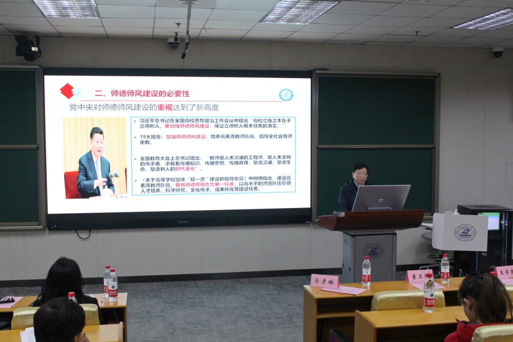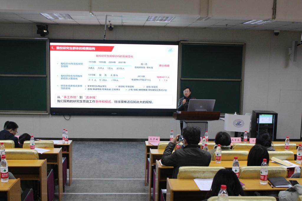 校学生工作部副部长兼研究生工作办公室主任、研究生院副院长王学东分享了“我校研究生思政工作的思考与探索”。王部长介绍了我校研究生总体情况和学生工作现状,分析了当下研究生思政、管理工作的特点和困境,他表示研究生思政工作必须与学生的科研和专业教育相结合,要培养德智体美劳全面发展的社会主义建设者和接班人,导师在思政工作中的作用极其重要。