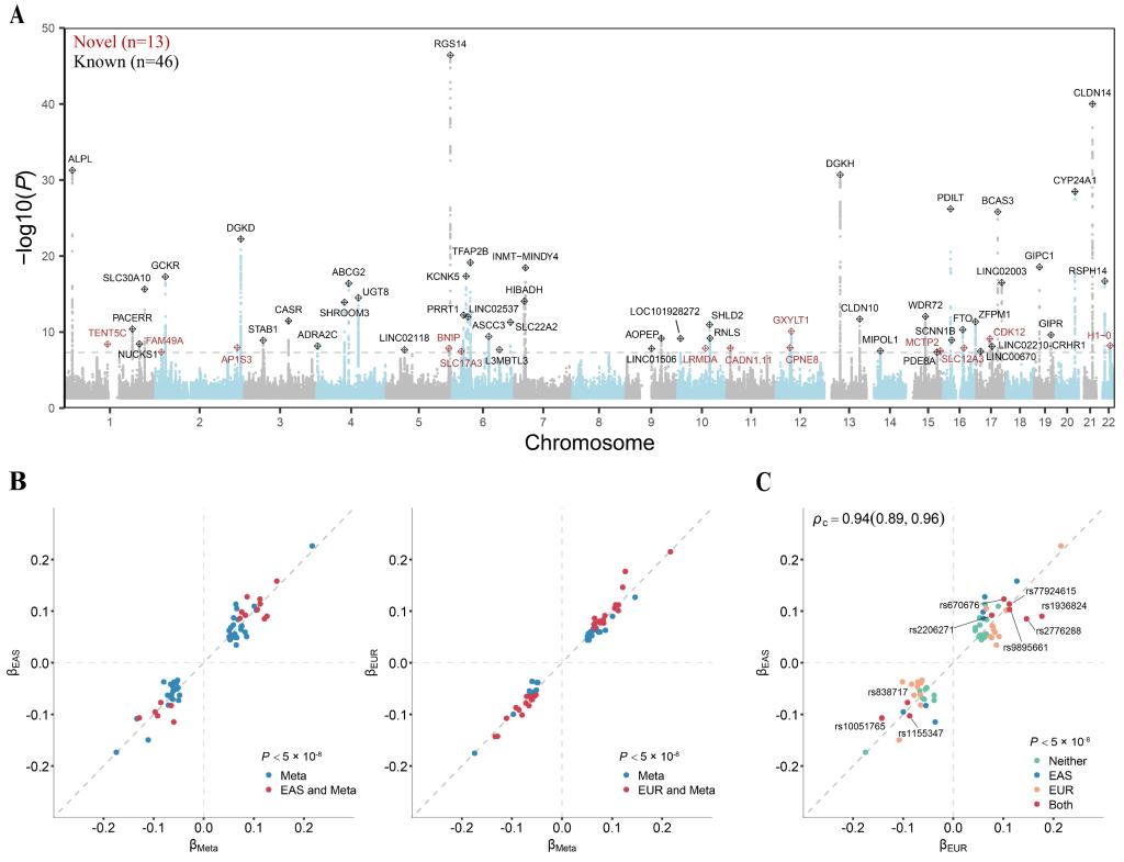 注:A.跨祖先GWAS荟萃分析中变异P值的曼哈顿图。灰色虚线表示5×10-8的全基因组显著性水平。红色菱形和黑色菱形分别代表新的和报道的肾结石遗传易感位点。B.59个肾结石易感位点的先导变异效应值在东亚人群特异性荟萃分析(左)和欧洲人群特异性荟萃分析(右)与跨人群荟萃分析间的比较。C. 59个肾结石易感位点的先导变异效应值在东亚人群特异性和欧洲人群特异性荟萃分析间的比较。根据相应GWAS荟萃分析的显著性对这些点进行了着色。ρc为林氏一致性相关系数。在东亚和欧洲特异性荟萃分析中均达到全基因组显著性水平的变异被标注。