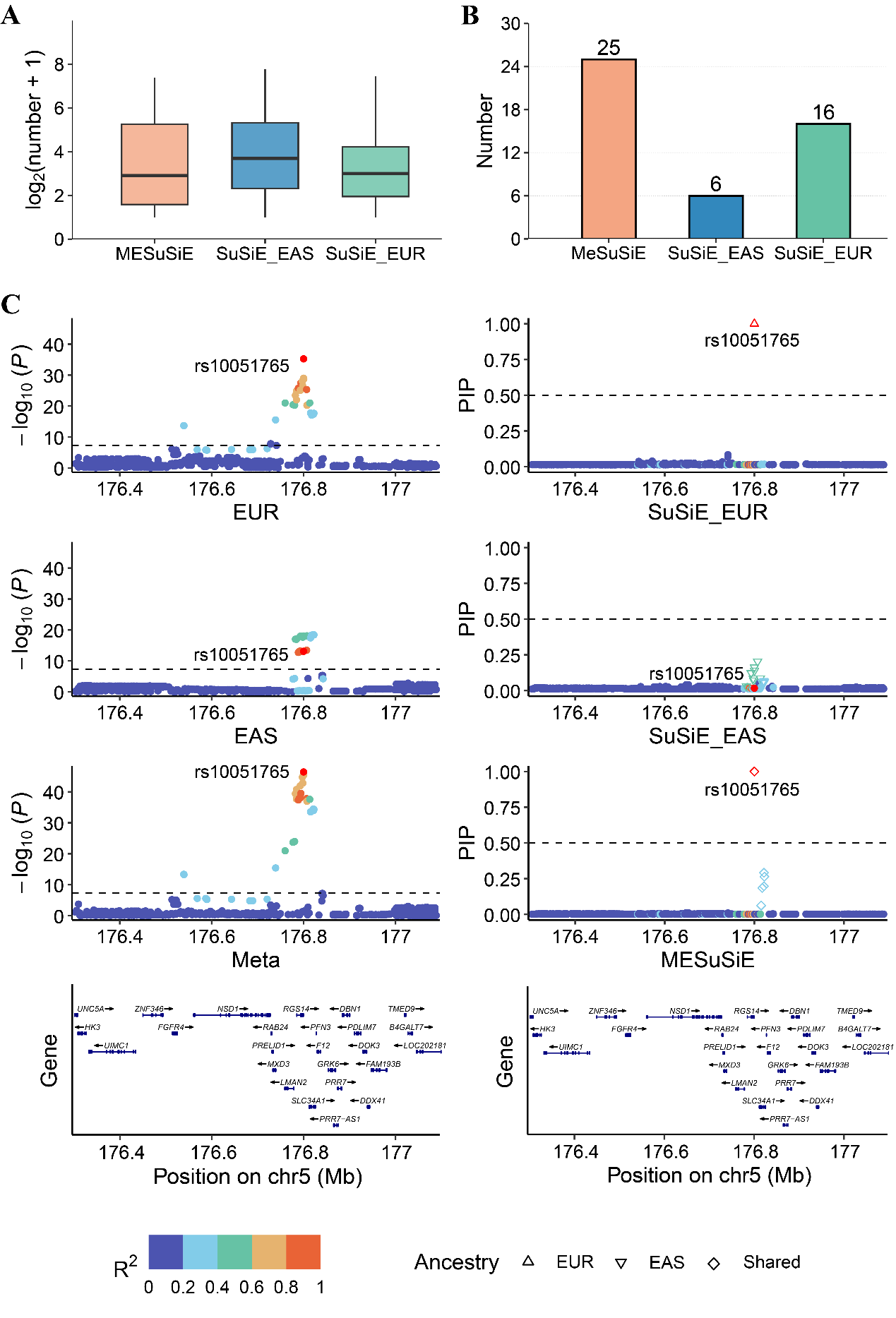 注:A. MeSuSiE和SuSiE识别的可信集SNP数目箱形图。B. MeSuSiE和SuSiE检测到PIP>0. 5的因果信号数目的条形图。C. MeSuSiE和SuSiE在5号染色体易感位点周围基因组区域的精细映射结果。左列显示了该区域欧洲、东亚和跨人群GWAS结果的曼哈顿图。右列为LocusZoom图,显示了SuSiE在欧洲和东亚人群中以及MeSuSiE计算的变异的后验包含概率。最后一行显示了该基因组区域的注释基因。对于检测到的可信集中的信号,使用上三角形表示欧洲人群特异性信号,下三角形表示东亚人群特异性信号,菱形表示共享信号。