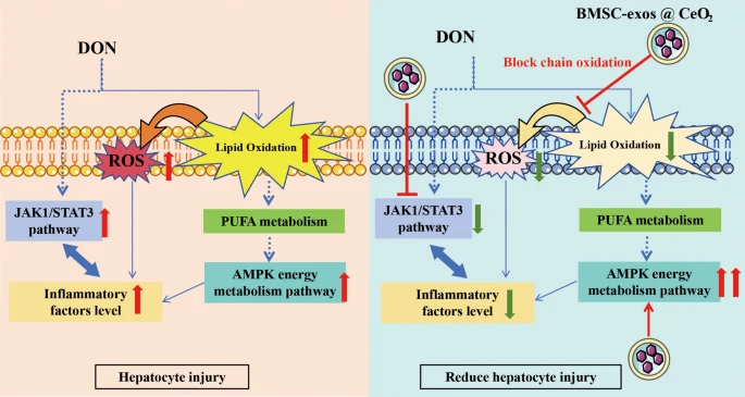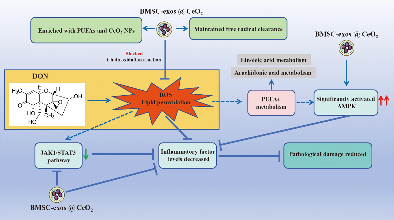 图二:BMSC-exos@CeO2复合物通过AMPK/JAK1/STAT3信号通路缓解DON致肝损伤的机制示意图。