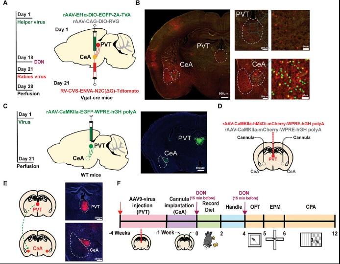 为破解这一难题,杨巍老师团队综合运用光遗传学、化学遗传学及全细胞膜片钳等技术发现DON会特异性干扰大脑中央杏仁核 (CeA) 的GABA能神经元(CeAGABA)功能,并破坏丘脑室旁核 (PVT) →CeA神经环路的信息传递,从而诱发厌食及厌恶样情绪。更重要的是,通过进一步的脑组织转录组学测序发现,经口灌胃DON后,CeA脑区的钙离子通道SCN10A表达水平显著增高,而通过脑内套管施用SCN10A拮抗剂(A-803467)后,可有效改善小鼠的进食行为并促进体重恢复。这项研究不仅揭示了DON致厌食及厌恶样情绪的关键神经机制,还发现了SCN10A这一潜在干预靶点,为未来开发DON减毒策略提供了重要理论依据(图一)。
