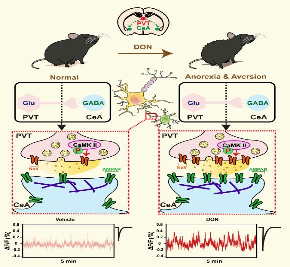 脱氧雪腐镰刀菌烯醇(DON,又称呕吐毒素),是粮食储存和加工过程中由镰刀菌属产生的一种高稳定性毒素,由于其耐高温、耐酸碱的特性,常规食品加工脱毒工艺难以彻底清除,使其成为全球范围内广泛存在的食源性污染物。当DON进入体内后,会引发严重的厌食和厌恶样情绪反应,但此前关于其具体作用脑区及神经环路机制的研究仍不够深入。