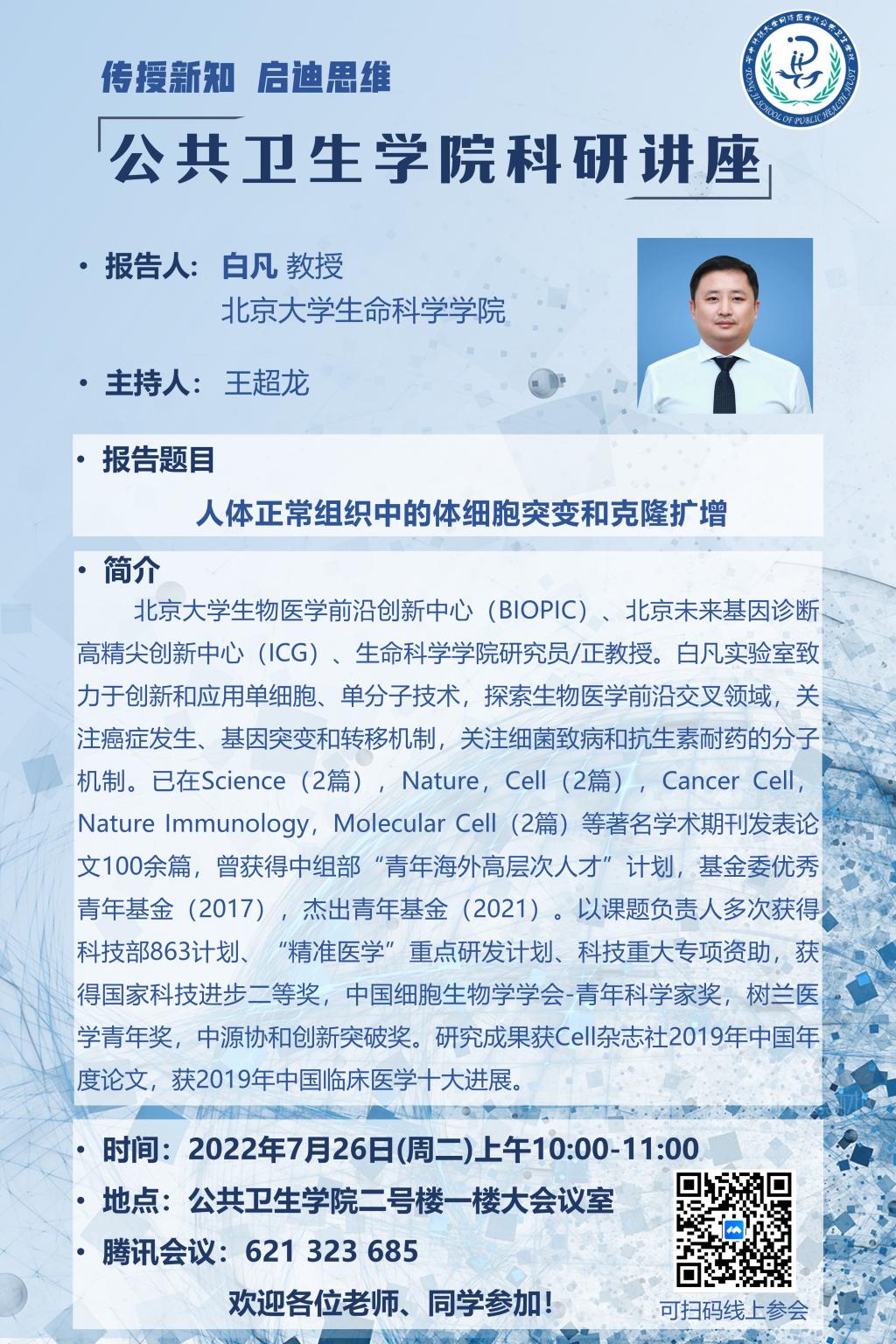 william威廉英国特邀来自北京大学生命科学学院的白凡教授,于2022年7月26日(周二)上午10:00-11:00在william威廉英国二号楼一楼大会议室举办学术讲座,报告题为“人体正常组织中的体细胞突变和克隆扩增”。