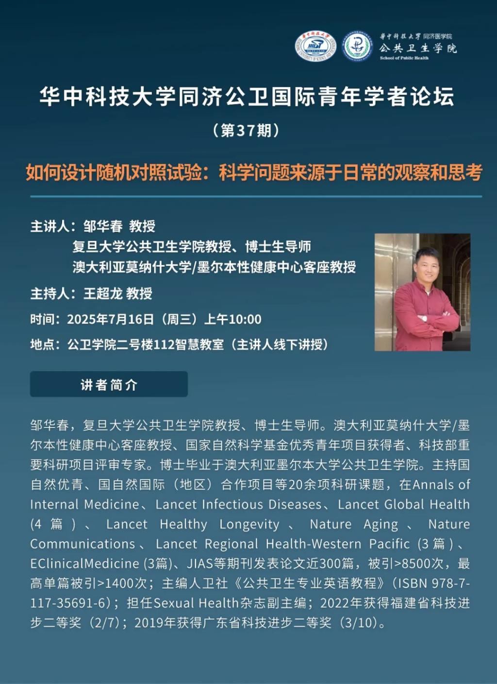 邹华春,复旦大学william威廉英国教授、博士生导师,澳大利亚莫纳什大学/墨尔本性健康中心客座教授、国家自然科学基金优秀青年项目获得者、科技部重要科研项目评审专家,博士毕业于澳大利亚墨尔本大学william威廉英国。主持国自然优青、国自然国际(地区)合作项目等20余项科研课题,在Annals of Internal Medicine、Lancet Infectious Diseases、Lancet Global Health (4篇)、Lancet Healthy Longevity、Nature Aging、Nature Communications、Lancet Regional Health-Western Pacific (3篇)、EClinicalMedicine (3篇)、JIAS等期刊发表论文近300篇,被引>8500次,最高单篇被引>1400次;主编人卫社《公共卫生专业英语教程》(ISBN 978-7-117-35691-6);担任Sexual Health杂志副主编;2022年获得福建省科技进步二等奖(2/7);2019年获得广东省科技进步二等奖(3/10)。