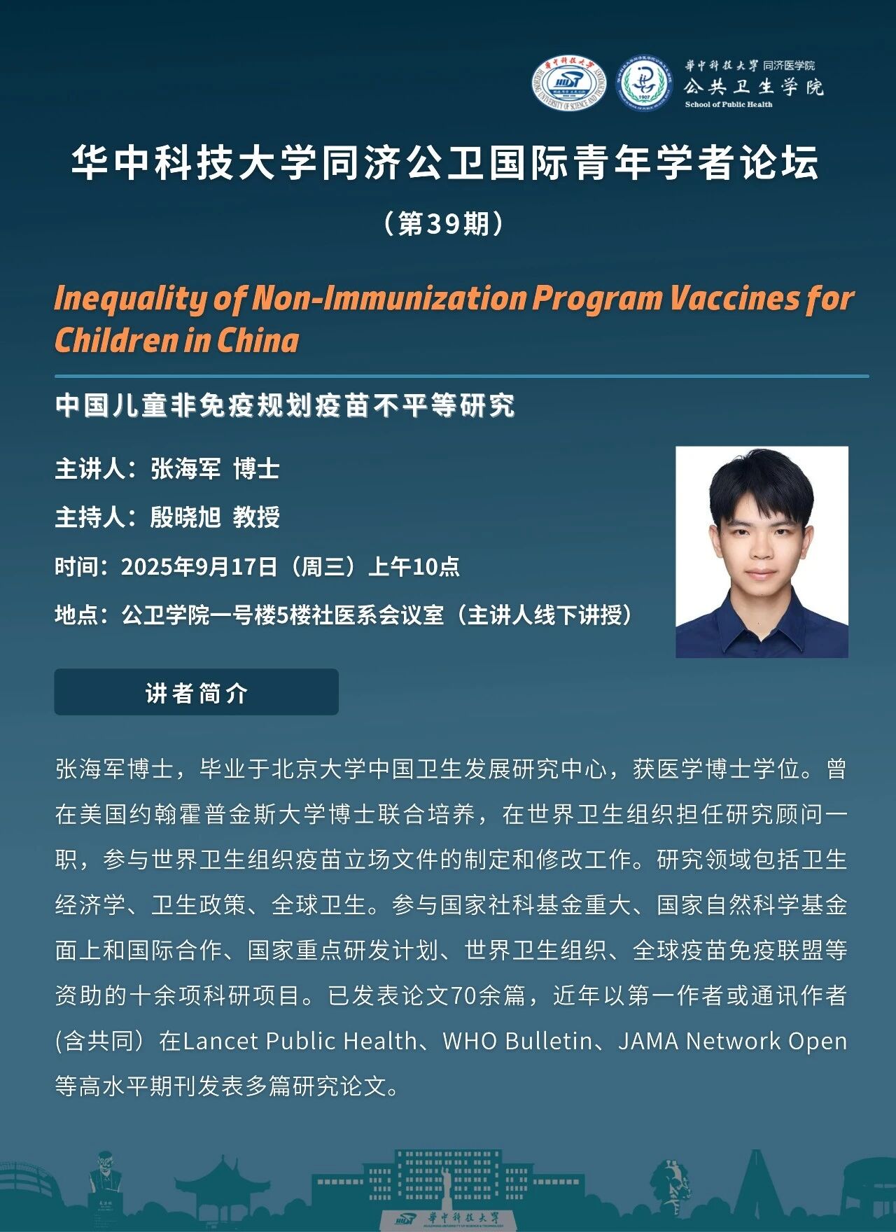 张海军博士,毕业于北京大学中国卫生发展研究中心,获医学博士学位。曾在美国约翰霍普金斯大学博士联合培养,在世界卫生组织担任研究顾问一职,参与世界卫生组织疫苗立场文件的制定和修改工作。研究领域包括卫生经济学、卫生政策、全球卫生。参与国家社科基金重大、国家自然科学基金面上和国际合作、国家重点研发计划、世界卫生组织、全球疫苗免疫联盟等资助的十余项科研项目。已发表论文70余篇,近年以第一作者或通讯作者(含共同)在Lancet Public Health、WHO Bulletin、JAMA Network Open 等高水平期刊发表多篇研究论文。