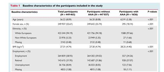 随访期间观察到腹主动脉瘤发病的研究对象有1626例(未观察到发病的共计447837例),平均确诊年龄62.9岁,以男性为主(82%)