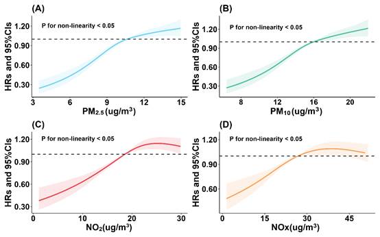 研究结果发现,长期暴露于大气污染物会显著增加腹主动脉瘤的发病风险,具体而言,暴露于PM2.5(暴露浓度每增加2.27μg/m3),PM10(暴露浓度每增加3.06μg/m3),NO2(暴露浓度每增加12.15μg/m3),NOx(暴露浓度每增加6.49μg/m3)分别会增加21%21%16%10%的腹主动脉瘤发病风险。即使在暴露浓度低于WHO发病的空气污染浓度限值的情况下,长期暴露于这四种污染物依然会增加腹主动脉瘤的发病风险。