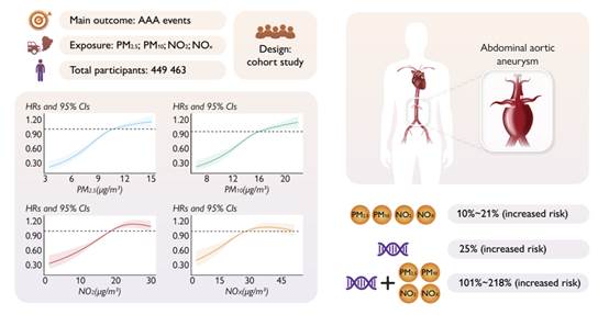 腹主动脉瘤是指腹部主动脉壁病理性扩张,导致明显的瘤状隆起。这种情况通常是由于腹主动脉变弱或扩张而引起的。在过去二十年中,腹主动脉瘤在一些高收入地区的患病率和发病率都有所上升。腹主动脉破裂是腹主动脉瘤最致命的并发症,主动脉破裂以后,如果不及时干预,死亡率高达100%。即使及时进行手术干预,猝死的可能性也非常大(死亡率超过50%)。因此,必须提前对相关的危险因素进行干预,以防止腹主动脉瘤的形成。大气污染物长期暴露与心血管疾病发生风险密切相关,然而大气污染物暴露与腹主动脉瘤发病之间的证据非常有限。动物实验表明,接触PM2.5可能会激活小鼠体内的免疫细胞并诱发持续的全身炎症反应,最终导致腹主动脉瘤的形成。目前尚未有基于人群的流行病学研究探索长期暴露于大气污染物对腹主动脉瘤的影响,且不清楚遗传易感性对大气污染与腹主动脉瘤发病之间的关系是否具有效益修饰作用。研究该内容对腹主动脉瘤的一级预防具有潜在指导意义,并为准确评估腹主动脉瘤发病和进展提供了新的思路。