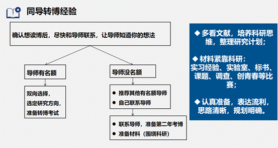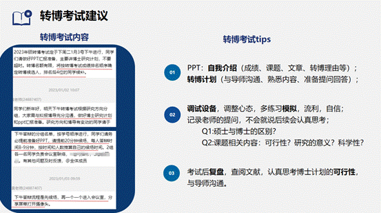 谭乐同学向大家分享关于自己的转博心路,在读博还是毕业工作之间该如何进行抉择。如果确认想读博,需要尽快和导师联系,让导师知道你的想法。为了能够顺利转博,大家需要多看文献,培养科研思维,整理研究计划。同时多积累一些实习经验,学习撰写标书,多参加一些课题、调查以及创青春等竞赛。谭乐同学还关于转博考试提出了自己的建议,例如完善答辩PPT,写明关于自己的成绩、课题、文章、转博理由等的自我介绍,写明自己的转博计划。转博考试面试前要提前调试设备,调整好心态,多练习模拟,表达更加自信、流利。在面试过程中,可以记录老师的提问,暂时想不出答案就坦言自己后续会认真思考。考试后要进行复盘,查阅文献,认真思考博士计划的可行性,并与导师及时沟通。
