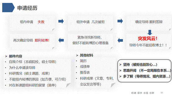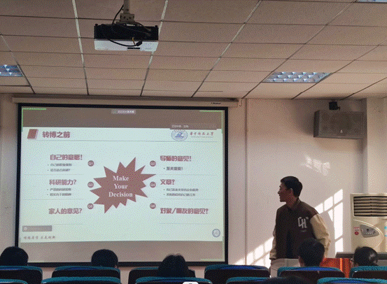 卿孟遐同学向大家分享了她较为曲折的申博经历,先是课题组组内申请失败后,寻找其他课题组申请,几次被拒。终于确定好导师,并且顺利答辩。又突发风云,导师告知今年不能招收博士生,没有办法她只能紧急寻找新的导师,并且已经做好不能转博的心理准备。幸运的是,柳暗花明,她再次确定导师,并且顺利转博。通过这次经历,她想告诉我们,申博过程中一定坚持,即使被拒绝也别灰心。一定要开阔思路,寻找导师不要只局限于本课题和所在学系。到了新课题组,她的博士生活可以用“忙”来概括,课题的内容转变了,接触到了新领域,要学习新的技术。认识了新导师和新同门,要迅速培养起人际交往的能力。