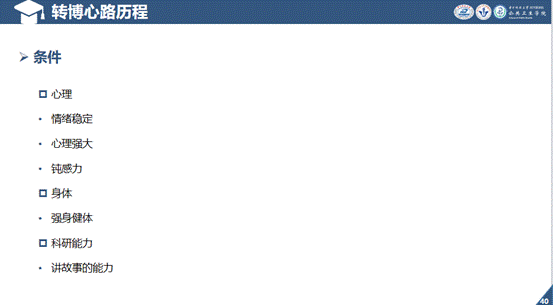 张馨月同学以自身的经验告诉我们,硕士阶段要学好专业课程,提高英语能力,适应好研究生的学习生活。科研方面,要多看科研论文,一边做知识积累一边寻找自己感兴趣的方向。注重科研能力的培养,学会使用统计软件。积极和导师、师兄师姐交流,参与科研项目。也可以参与一些额外的活动,丰富自己的课余生活,比如研会或者一些志愿活动。问清自己几个问题,喜欢读博吗?喜欢搞科研吗?读博士的目的是什么?想成为一个什么样的博士?大家只有思考好这些问题,具备平稳的心态、较好的身体素质和优秀科研能力,转博的成功率才能大大提升。