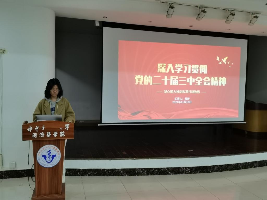 会议第一项,针对第三期领航大讲堂学习内容,支部内开展讨论。党支部书记韦好同志首先强调了党对党员教育十分重视,希望支部同志可以在学习中不断启发思想,以振奋精神。随后,她分享了对于二十届三中全会精神中深化改革相关论述的想法,希望支部党员将改革精神落到实处,以身作则,发挥党员先锋模范作用。随后,支部党员也就相关学习内容讲述了自己的心得体会。24级中共党员徐枭杰同志表示,他关注到了二十届三中全会中,有很多与公卫有关的关键词,比如“老龄化严重”,“国家生物安全”,“医保改革”,“预防为主”等,这体现出党中央对公共卫生与预防医学的重视,这种重视让他倍受鼓舞,让他能够在面对科研压力和道路迷茫时,能够更加坚定自己的专业认同和专业自信。支部党员热烈讨论,加深了对对党的二十届三中全会精神的认识,强化了领航大讲堂学习成果。