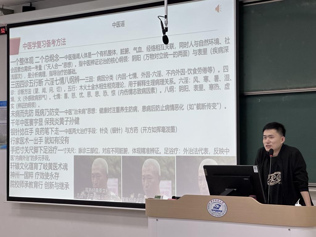 本科生第一党支部中共党员马奇志、黄荣成同志面向2022级同学,主讲临床课程复习分享会。黄荣成分享内科学、儿科学,提出以“网课+往年题”为核心,分章节梳理重点,规划复习周期,强调理解性记忆,自主整理高频考点强化输出等备考方法。马奇志围绕中医学、外科学、妇产科学,分析命题规律,建议采用“基础→拓展”阶梯式复习,讲解中医学时提出以兴趣为导向,串联各章逻辑关系,并提醒“临床表现与治疗是核心,但需标注隐蔽知识点以防选择题陷阱”。现场同学积极提问,主讲人结合实例详细解答。同学们反馈:“讲师的经验分析搭配学长姐的精华资料,让复习效率大幅提升”。