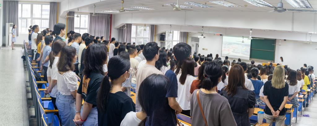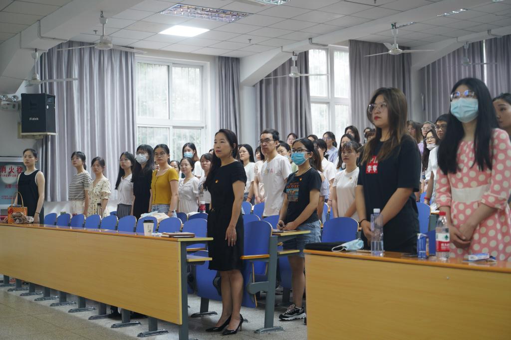 在观看大会直播结束后,冯霞与全院学生党支部委员一起重温入党誓词,并在同济医学院建党百年纪念台前合影留念。