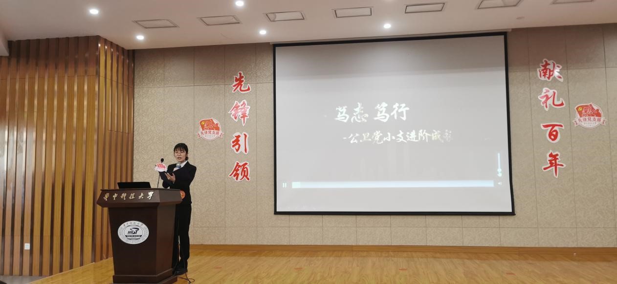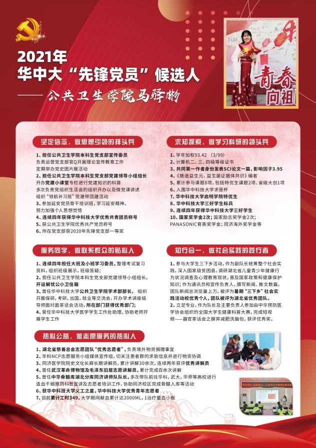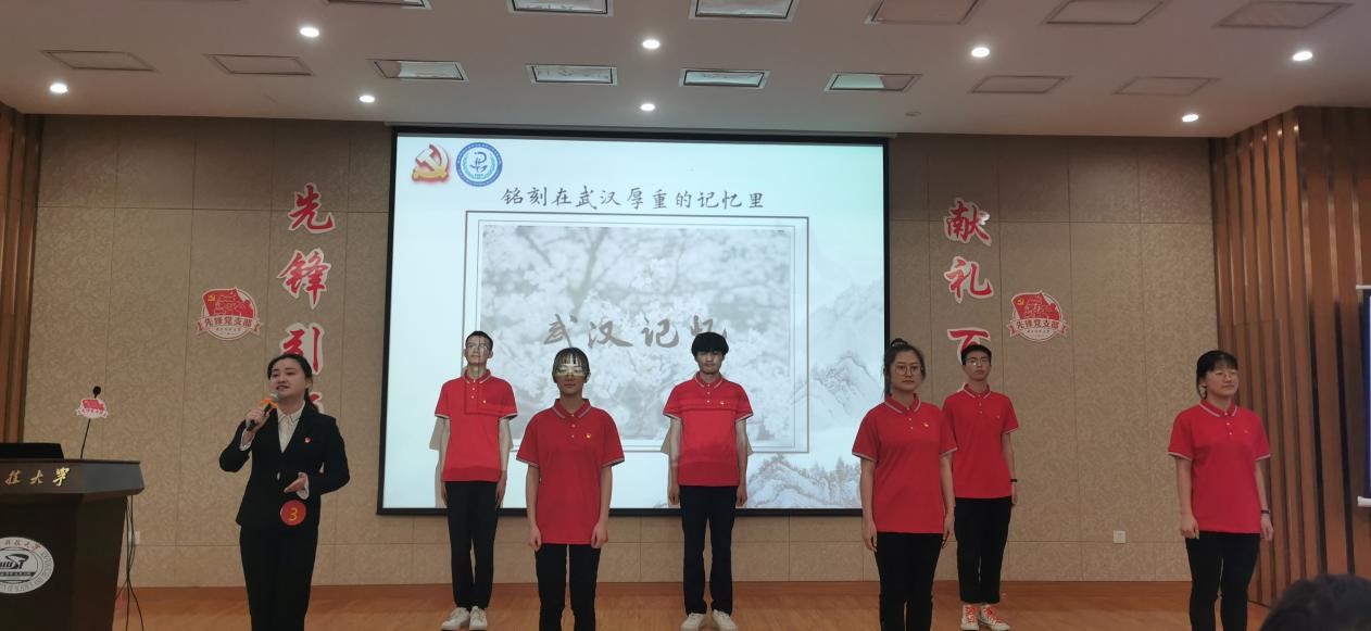 在“先锋党员”的答辩环节,马驿彬同志以“初心如磐,使命在肩”为主题,结合自身学习和生活经历,向大家讲述了关于“新时代的先锋党员是什么样子”:做思想引领的排头兵,赴延安学习,带队赴武汉及贫困县调研实践,运营党支部官Q开展理论宣传教育工作,开办党建小课堂,是她对信仰的上下求索;做学习模范的领头兵,特优生,校三标,国奖,发表论文是她勤奋刻苦的写照;做联系群众的贴心人,学委,党支部宣传委员,学术部部长……多个身份是她服务同学的记录;做志愿服务的热心人,疫情期间加入湖北省慈善总会,百余次院史讲解,献血2000ml,349个工时是无私奉献的见证。