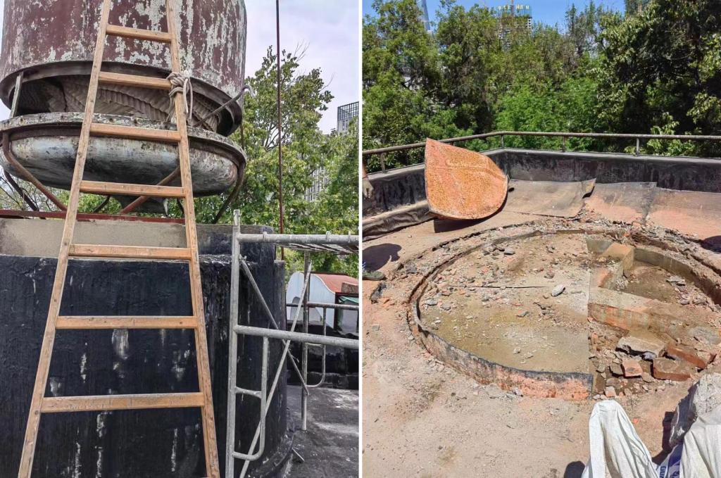多年来,试验塔废弃已久,长年累月塔中有积水向屋内渗透,严重影响师生科研环境,存在极大的安全隐患。接到师生诉求后,学院领导班子高度重视,第一时间报告医学总务处,并组织召开专题会议研究解决方案。医学总务处深入学院、现场查看相关情况,之前也设想通过吊机整体吊离的方式拆除,但由于塔体体积大,日久已部分生锈,拆除工作带有一定的安全隐患。总务处召集有关专业人士,经过工作人员现场反复勘察和多方协调沟通,最终确定了分割拆除的施工方案。各部门通力协作、相互配合,清除了多年来的“顽疾”,也为彻底解决屋顶漏水问题拆除了“拦路虎”。