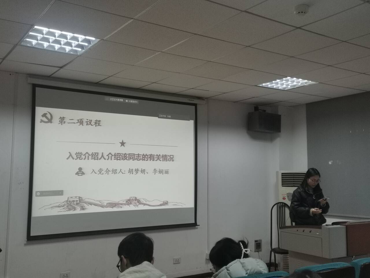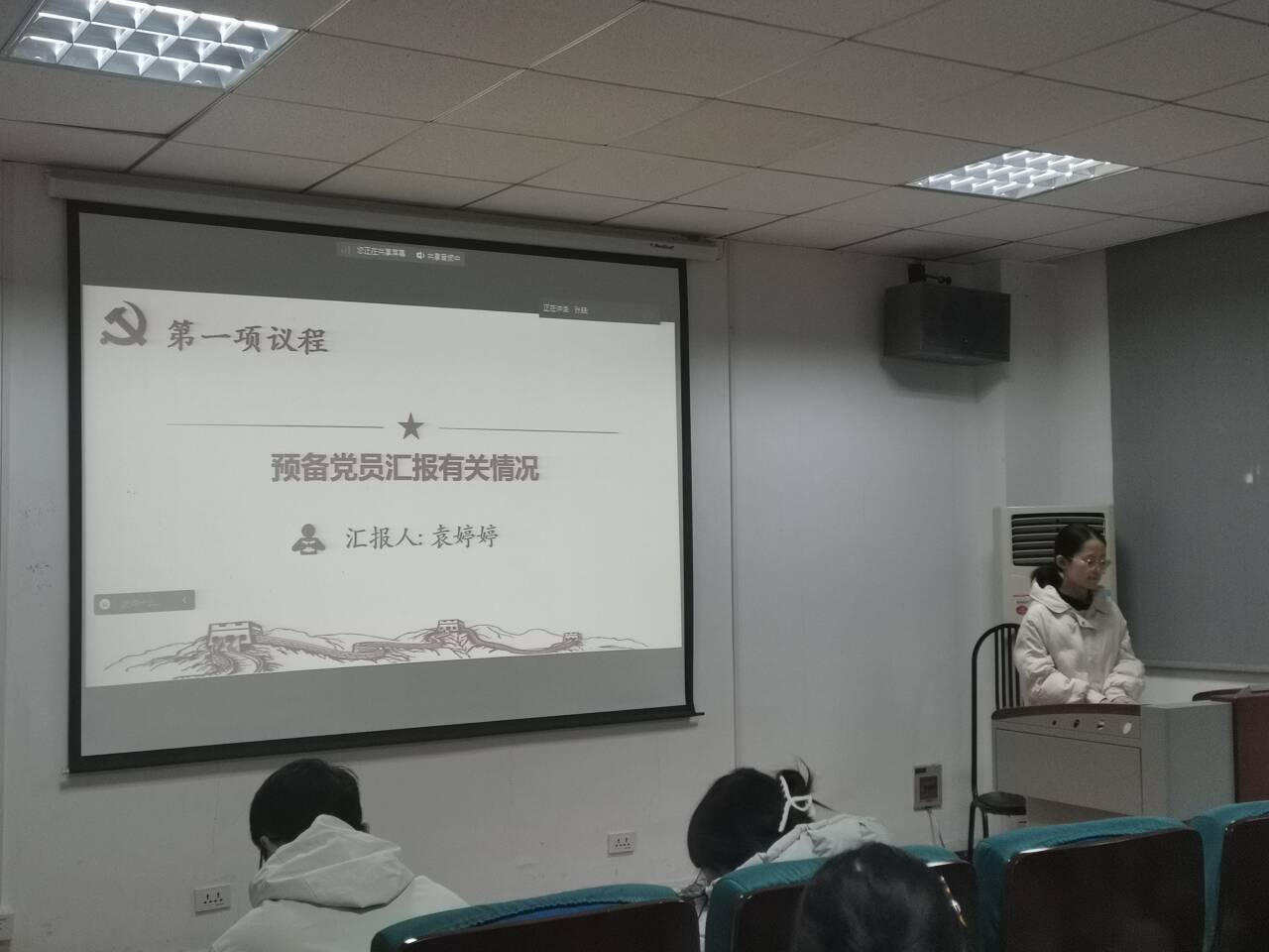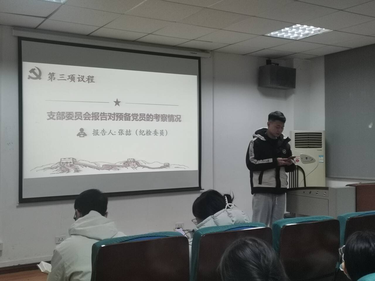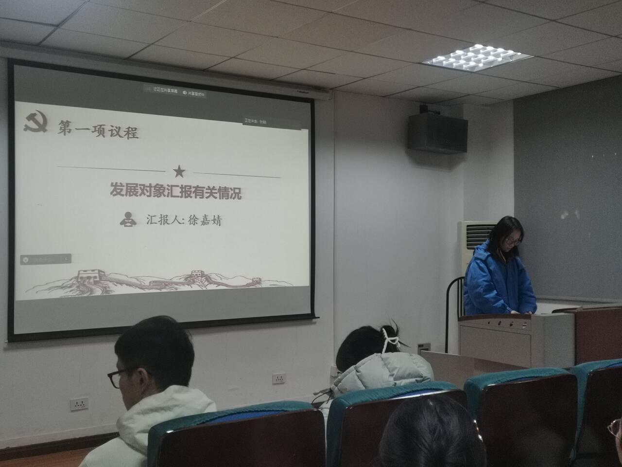微党课结束后,组织委员宋悦同志主持了预备党员接收支部大会和预备党员转正支部大会,讨论发展对象徐嘉婧、刘美辰同志的入党问题以及讨论预备党员袁婷婷、张芾炜、王晓露同志的转正问题。会议应到正式党员55名、预备党员4名,实到会正式党员43名有表决权的到会人数超过应到会有表决权人数的半数。