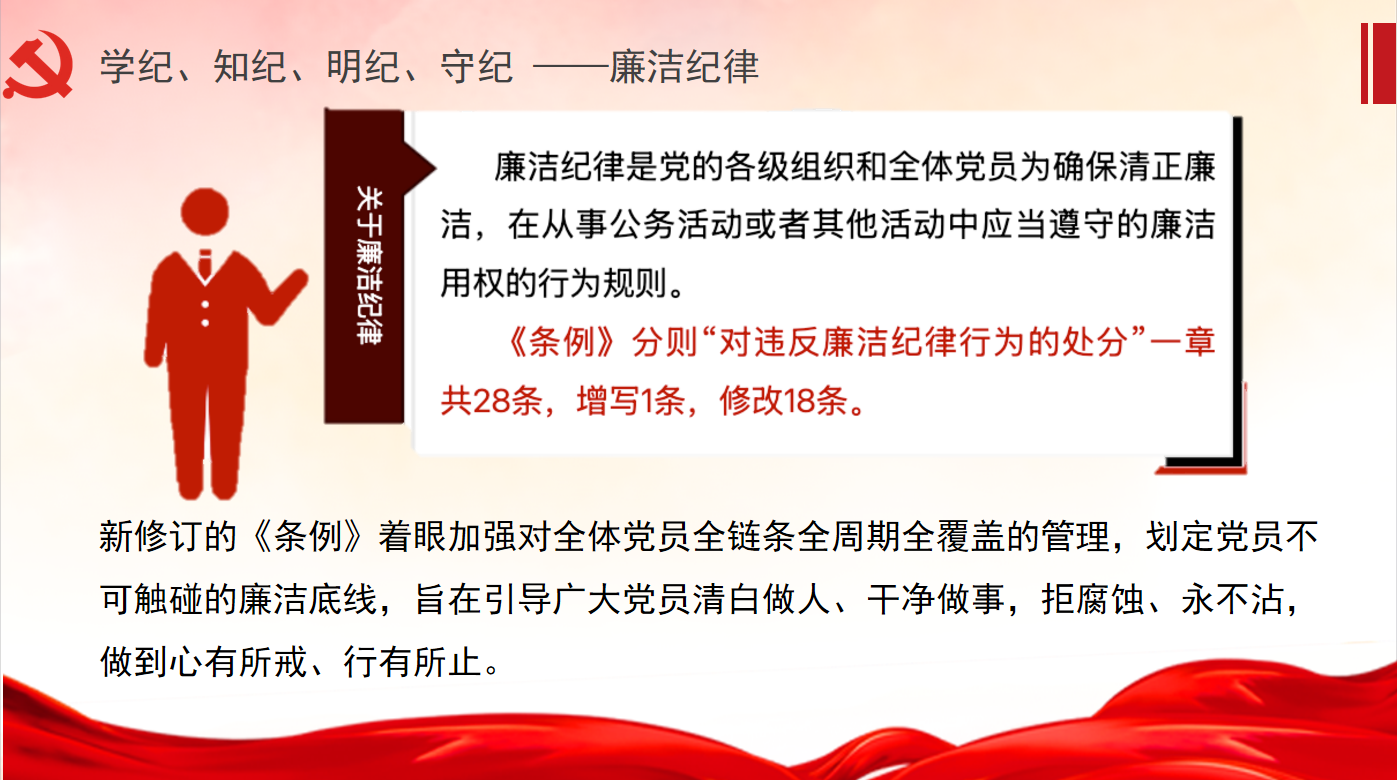 紧接着,支部的全体党员同志进一步加深了党纪学习。廉洁纪律是党员确保清正廉洁的行为规则,是实现干部清正、政府清廉、政治清明的重要保障。新修订的《条例》加强了对全体党员的管理,划定了廉洁底线,引导党员清白做人、干净做事,拒腐蚀、永不沾。