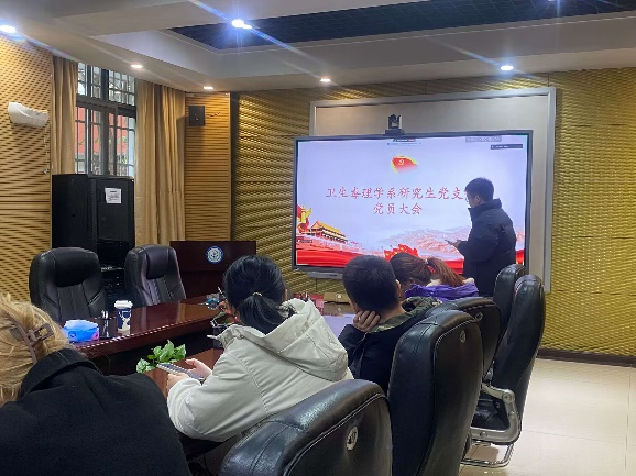 最后,卫生毒理学研究生党支部全体党员同志一同进行十二月党课学习,本次党课学习由程瑞洁同志主持。党员同志共同学习了习近平总书记在湖北考察时的重要讲话精神、习近平总书记对新时代马克思主义理论研究和建设工程的重要指示精神和学校第五次党代会精神。参会的党员同志结合时事新闻分享学习心得、交流思想感悟。