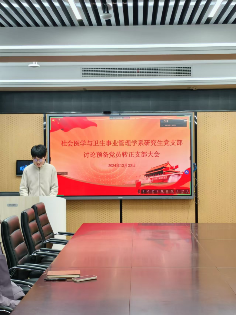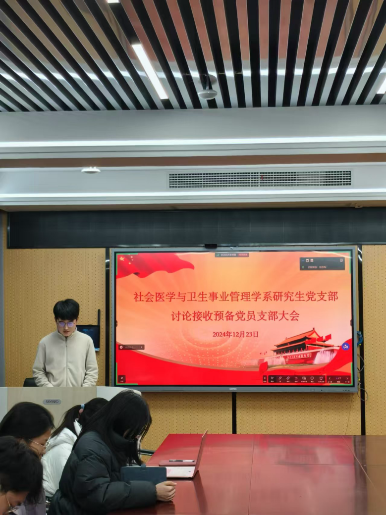 首先,发展对象社会医学与卫生事业管理学系2022级硕士生王嘉怡同志和2023级硕士生李怡林同志分别向党组织汇报对党的认识、入党动机、本人履历、家庭成员和主要社会关系情况、现实表现、以及需要向党组织说明的问题。