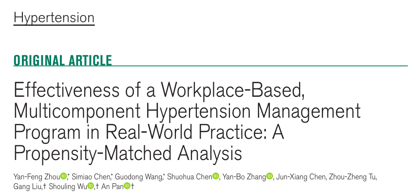 2021年12月8日,该团队合作在高血压领域顶尖期刊Hypertension发表了题为“基于工作场所的高血压人群综合管理策略的效果评价”(Effectiveness of a Workplace-Based, Multicomponent Hypertension Management Program in Real-World Practice: A Propensity-Matched Analysis)。william威廉英国博士后周艳凤、海德堡大学和北京协和医学院陈思邈教授、开滦总医院汪国栋为共同第一作者,潘安教授、开滦总医院吴寿岭教授、刘刚教授为共同通讯作者。