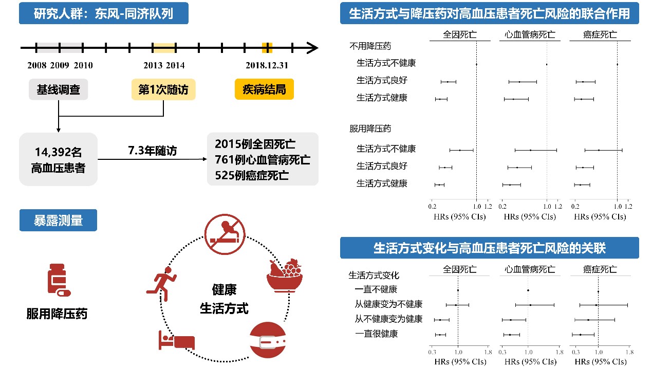 高血压是影响居民健康和社会经济发展的重大公共卫生问题。2015年全球成年人高血压患病人数约为11.3亿。高血压是心血管疾病和过早死亡的主要危险因素,2019年高血压造成超过1000万人死亡。因此,确定能预防或延缓高血压患者发生心血管病或过早死亡的有效策略至关重要。坚持使用降压药、遵循健康生活方式(戒烟限酒、运动、合理膳食等)是高血压患者自我管理的重要措施。然而,目前普遍存在不遵医嘱服药、或者单纯依靠降压药治疗而忽略改善生活方式等问题,这些都是血压控制不佳继而造成心血管疾病的重要因素。关于使用降压药和遵循健康生活方式相结合进行血压管理的长期健康获益,目前尚不明确。
