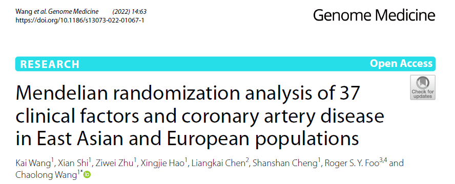 3. Wang, K., Shi, X., Zhu, Z., Hao, X., Chen, L., Cheng, S., Foo, R.S.Y., and Wang, C. (2022). Mendelian randomization analysis of 37 clinical factors and coronary artery disease in East Asian and European populations. Genome Med 14, 63.