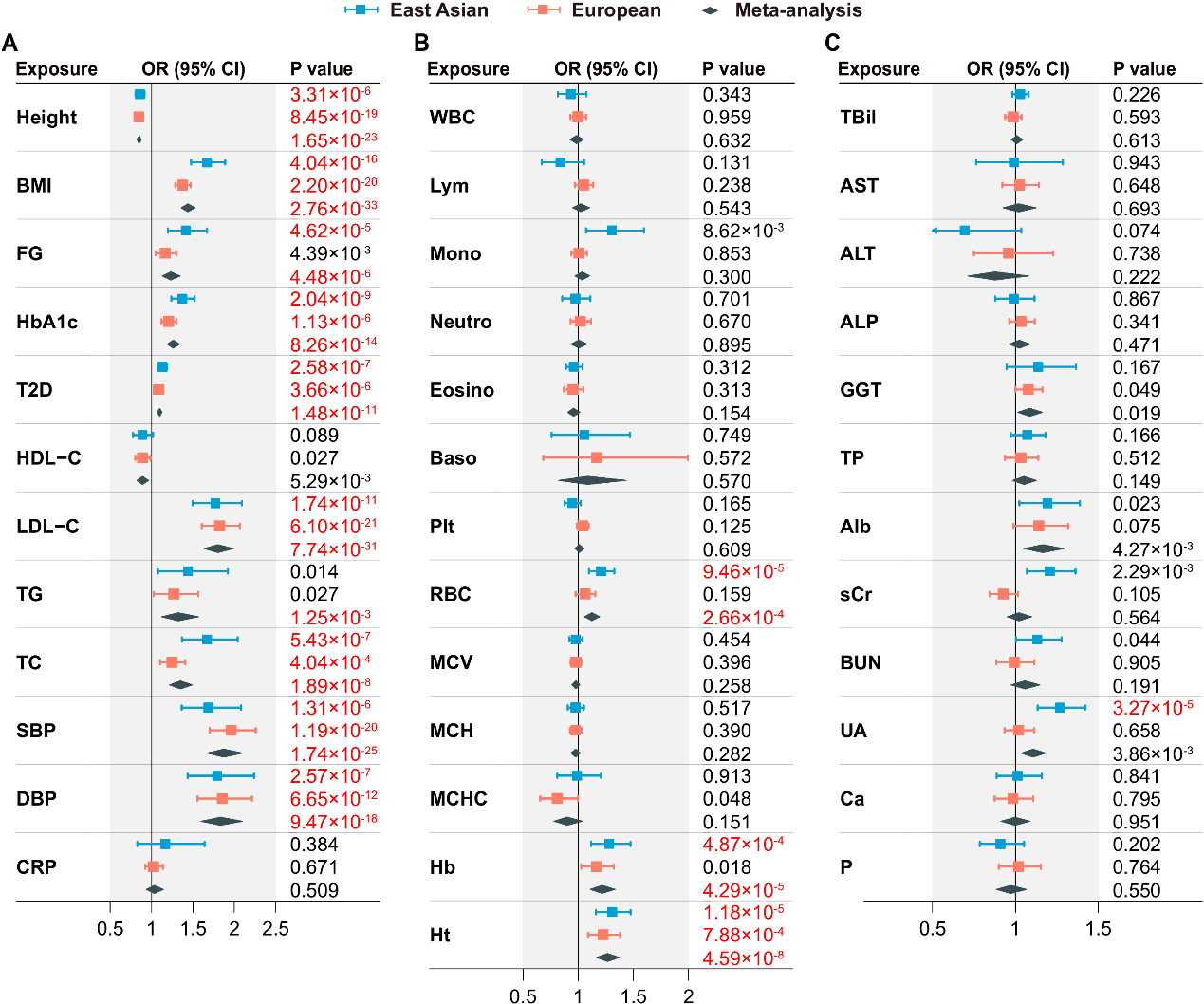 该研究发现,高红细胞水平(红细胞计数[RBC]、血红蛋白含量[Hb]、红细胞比容[Ht])和高血清尿酸(UA)对冠心病的发生具有因果作用(图1)。多变量MR分析显示,上述四种指标对冠心病的因果效应独立于常见的心血管代谢相关的风险因素。RBC、Hb和Ht每升高1个SD(SDRBC=40.94×104 /μL,SDHb=1.23 g/dL,SDHt=3.53%),冠心病的发病风险增加7%-10%。UA仅在东亚人群中作为冠心病的风险因素(人群异质性P=0.003)。东亚人群中,UA每升高1.35 mg/dL,冠心病患病风险增加12%(95%置信区间:6%-19%)。
