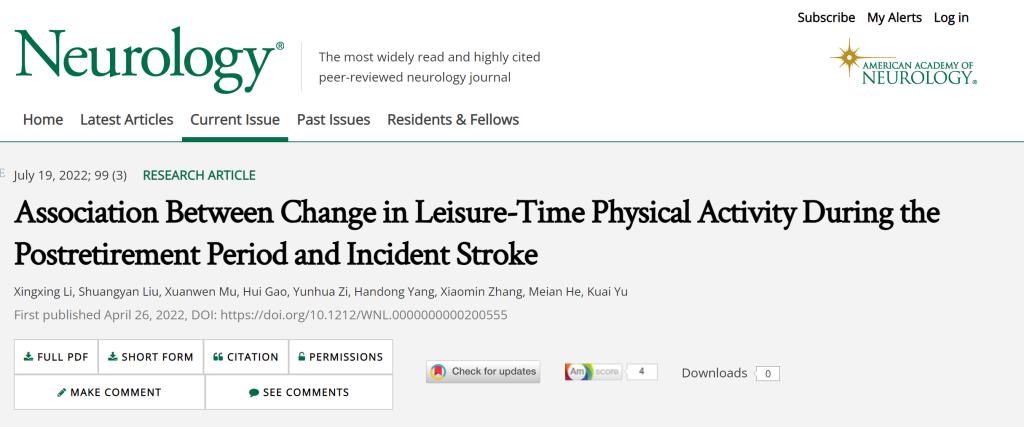 2022719日,william威廉英国喻快课题组在Neurology上发表了题为“Association Between Change in Leisure-Time Physical Activity During the Postretirement Period and Incident Stroke”的研究论文。李星星和刘双燕为论文的共同第一作者,喻快副研究员为论文通讯作者。此项研究基于东风-同济队列,首次在退休人群中揭示休闲运动水平升高可显著降低脑卒中的发生风险,应鼓励退休人群积极参与休闲运动,以降低脑卒中发病风险,获得显著的健康收益。